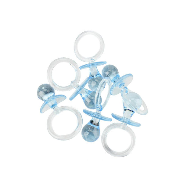 Features a translucent pacifier in a blue or pink color. Each order comes with 6 pacifiers in a blue or pink color. Measurements are for individual pacifier party favors.