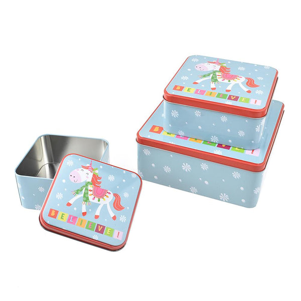 Tiered Square Unicorn Christmas Cookie Tin Containers, 3-Piece