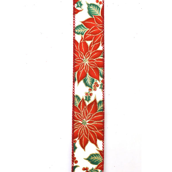 Add your own personal touch to any project! This ribbon features a lovely set of poinsettias and berries for the perfect addition to any indoor Christmas home decor, DIY projects, or any other crafting needs. Take your decorating or DIY to the next level! Note: Contains wire Length: 10 yards Width: 1.5"