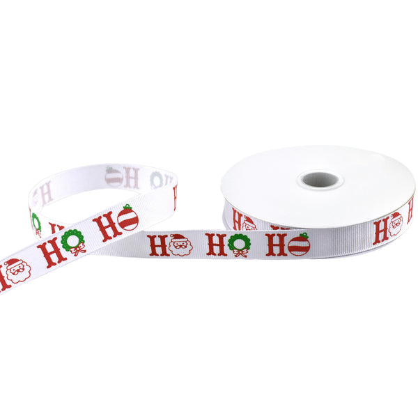Add some festive color and style to your Christmas tree with this adorable grosgrain ribbon! This festive ribbon works well for wrapping gifts, decorating packages, or any other craft project. The patterned design of Santa icons with the iconic 'Ho Ho Ho' phrase makes this the perfect Christmas DIY accessory! Note: Does not contain wire Length: 10 yd Width: 0.625"