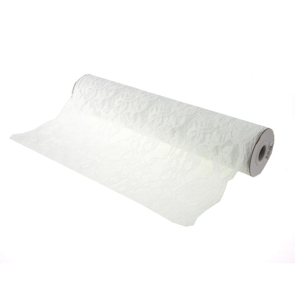 Add some classic, vintage charm to your tables with this beautiful floral lace roll! Use as a base for a linear display of candles, glass vases filled with delicate white flowers, or even bowls full of fruit.