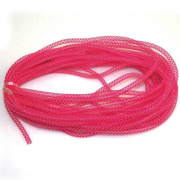 Tubing Mesh can be stretch, twist or bind to any desire shaped. It is hollow and you can run a ribbon or wire inside the tube. The colors represent in the tubing mesh is a foil that has been twist around the tube to create an iridescent effect.