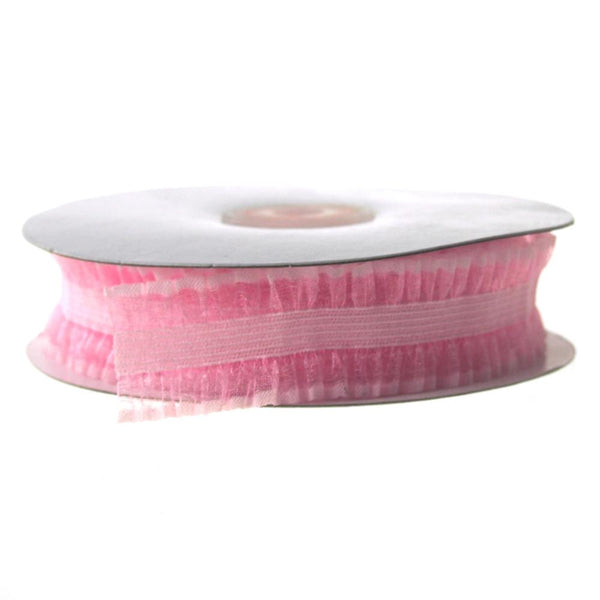 Ruffle ribbon features an elastic band, with pleated ruffles made of a sheer sparkly material edged in a lighter color, woven along both sides.