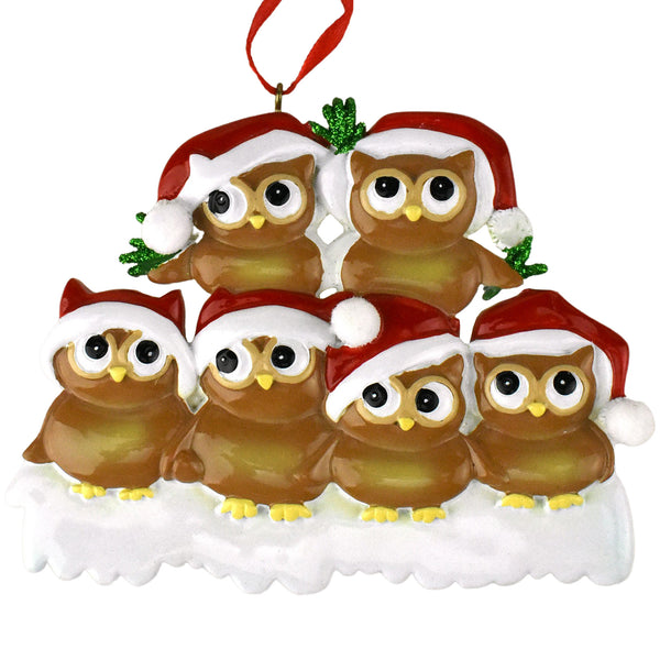 This adorable resin owl family of six is perfect for families of six or anyone who just loves owls. The ornament features six adorable owls wearing red and white Santa hats and blank cuffs on the hats. The base is white as well, so you can personalize it with your family members' names. This cute ornament is perfect for your Christmas tree, wreath, or home decorating. Length: 3.5" Width: 4.5"