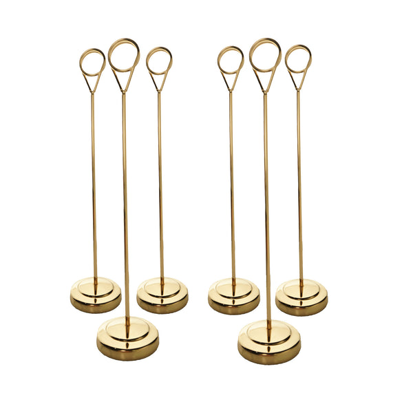 Add an elegant touch to your table decorations with these metal place card holders. These wonderful place card holders are great for weddings, anniversaries, quinceañeras, and more formal parties. Features a solid metal place card holder with a rounded top in the color gold or silver. Each order comes with 6 place holders. Length: 10" Width: 2"