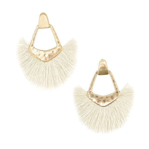 LOVELY FAN TASSEL EARRINGS - These fan tassel earrings feature a tear drop wire with fan shaped tassel, making it a unique and eye-catching piece to wear.