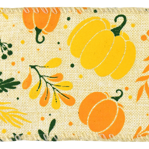 Get into the autumn season spirit with this beautiful ribbon befitting the season! This ribbon features a pumpkin patch print in rich fall colors against a natural brown canvas. This faux linen canvas ribbon is the perfect addition to any craft project, gift wrapping or holiday decor. Note: Contains wire Length: 10 yd Width: 2.5"