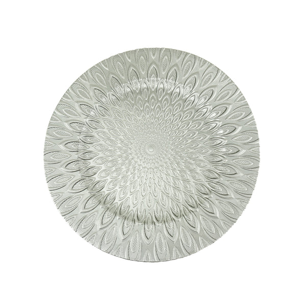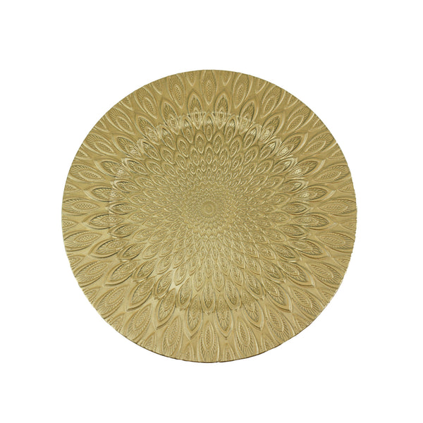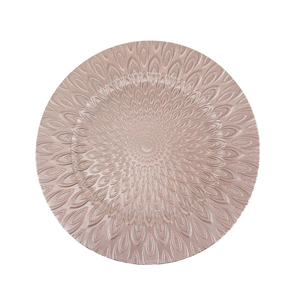 Decorate your next party or event with this textured peacock charger plate! These charger plates will be elegant decorations for your next event or party. These plates are great for weddings, birthdays, Thanksgiving and other holidays. Features a a round plate with a swirling peacock feather textured pattern in the colors gold, rose gold or silver. Diameter: 13" Height: 0.75"
