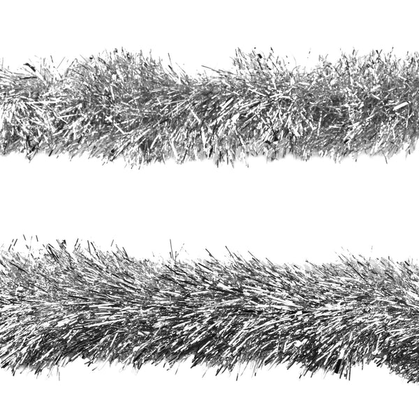 This tinsel foil Christmas garland is a classic holiday decoration that will last for years. It's perfect for the holidays, or any occasion where you want to add a touch of festivity to your home. This foil garland features tinsel strands, which are covered in shiny metallic foil that creates a festive look and a mesmerizing shimmer throughout your home! Length: 6.5 ft Width: 4"