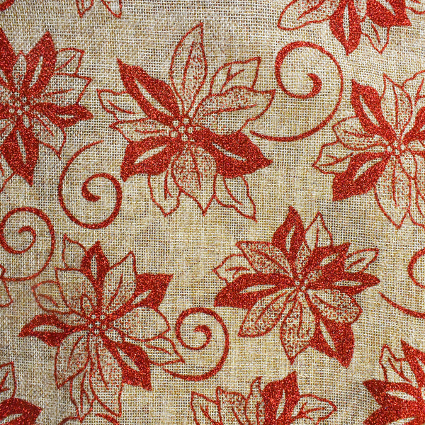 Dress your tree with this fabulous Christmas tree skirt! This festive Christmas tree skirt features a poinsettia flower pattern in a fashion-forward design that'll complement any classic holiday color scheme. Its natural jute fabric base adds country charm to your home decor, while the glitter details give it a sparkling shine. Diameter: 47.25"