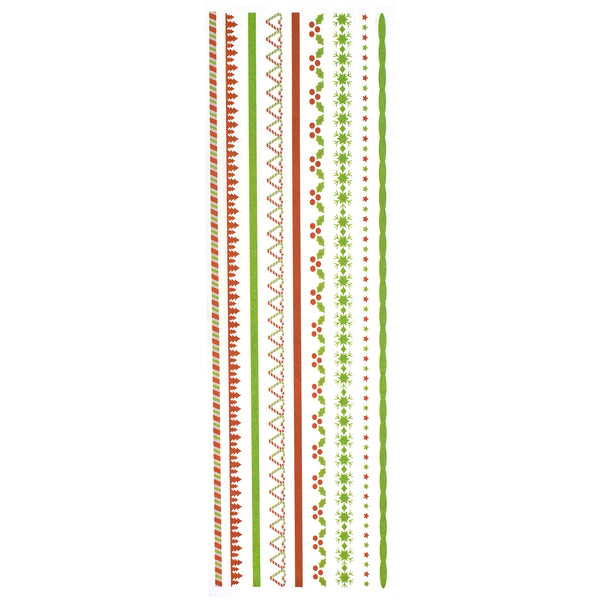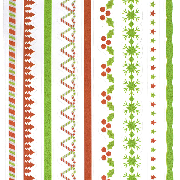 Add a festive touch to your Christmas projects and decorations with these adorable holiday stickers! The stickers feature long strips of classic Christmas themed broder lines including glittered stripes, candy canes, snowflakes, and holly berries. Perfect for any holiday DIY craft project! Pack: 9 stickers Sticker Length: 11.5"