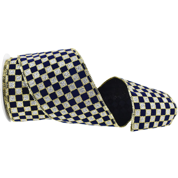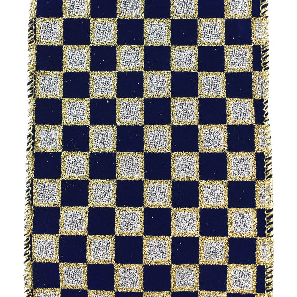 Glittered Checker Board Wired Ribbon, 4-Inch, 10-Yard - Navy Blue/Silver