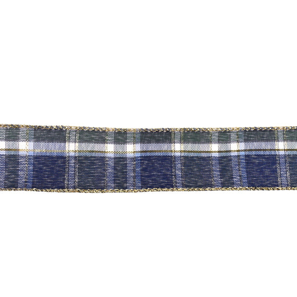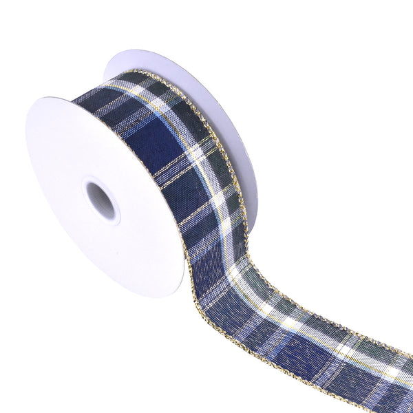 Gold Trim Plaid Wired Ribbon, 1-1/2-Inch, 10-Yard - Navy Blue/Moss