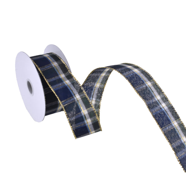 Add classic elegance to your holiday decor with this special holiday ribbon! It features a gold trim alongside a navy blue plaid pattern to match. It can be used for everything from making your own wreath to adding pattern to letters, blocks and more! Note: Contains wire Length: 10 yd Width: 1.5"