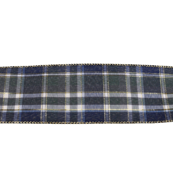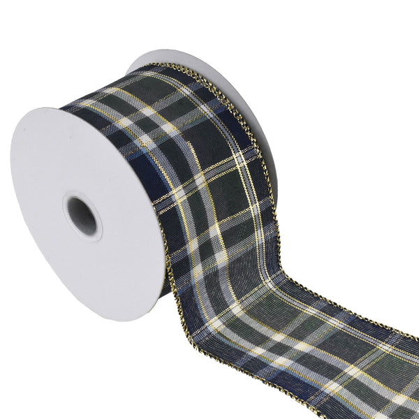 Gold Trim Plaid Wired Ribbon, 2-1/2-Inch, 10-Yard - Navy Blue/Moss