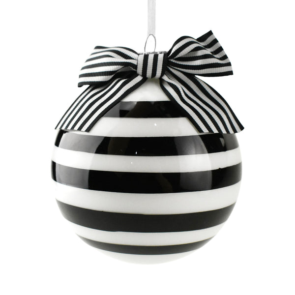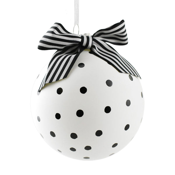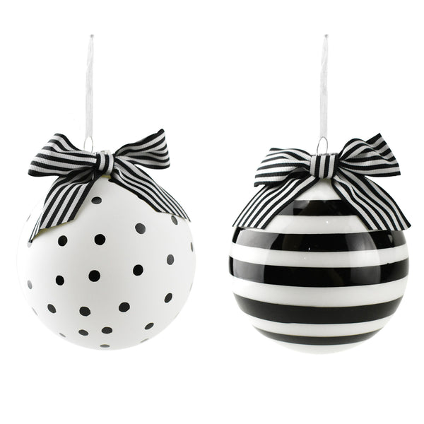 Bring a blended layering of natural and contemporary textures to your table this holiday season with this set of black and white ornaments! These cute black and white striped ball ornaments with white polka dots are sure make your Christmas tree stand out. These traditional holiday decorations have a festive, fun feel that will make you smile during the holidays. Pack: 2 pcs Ornament Diameter: 3.5"