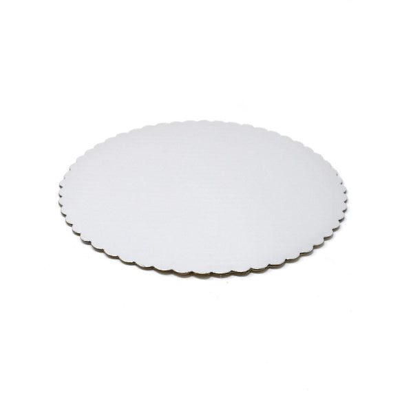 Make any cake look elegant on this gold/silver cake circle. This 8" round cake circle features a cardboard base with a gold/silver finish and a scalloped edge. The finish is on only one side. Perfect to use to display cakes.